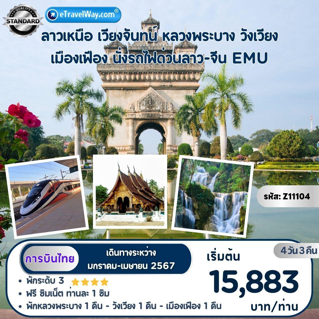 ลาวเหนือ เวียงจันทร์ - หลวงพระบาง - วังเวียง - เมืองเฟือง - นั่งรถไฟด่วนลาว, จีน EMU : ทำบุญ ตักบาตรข้าวเหนียว - สักการะพระธาตุพูสี - น้ำตกตาดกวางสี - ช้อปปิ้งตลาดมืด - บลูลากูน - ถ้ำนางฟ้า - แพน้ำลึก - วัดสีเมือง